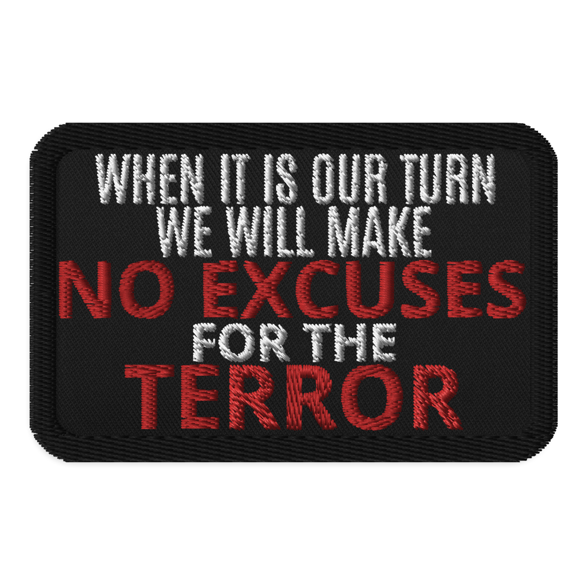An embroidered patch featuring a take on the famous Karl Marx quote from the Red Issue of the NRZ magazine in 1849. When our turn comes, we will make no excuse for the terror. All changes to world orders have required violence. If the powers that be will not legislate away their monopoly over liberty, then we must wrest our rights away from their cold, dead hands.